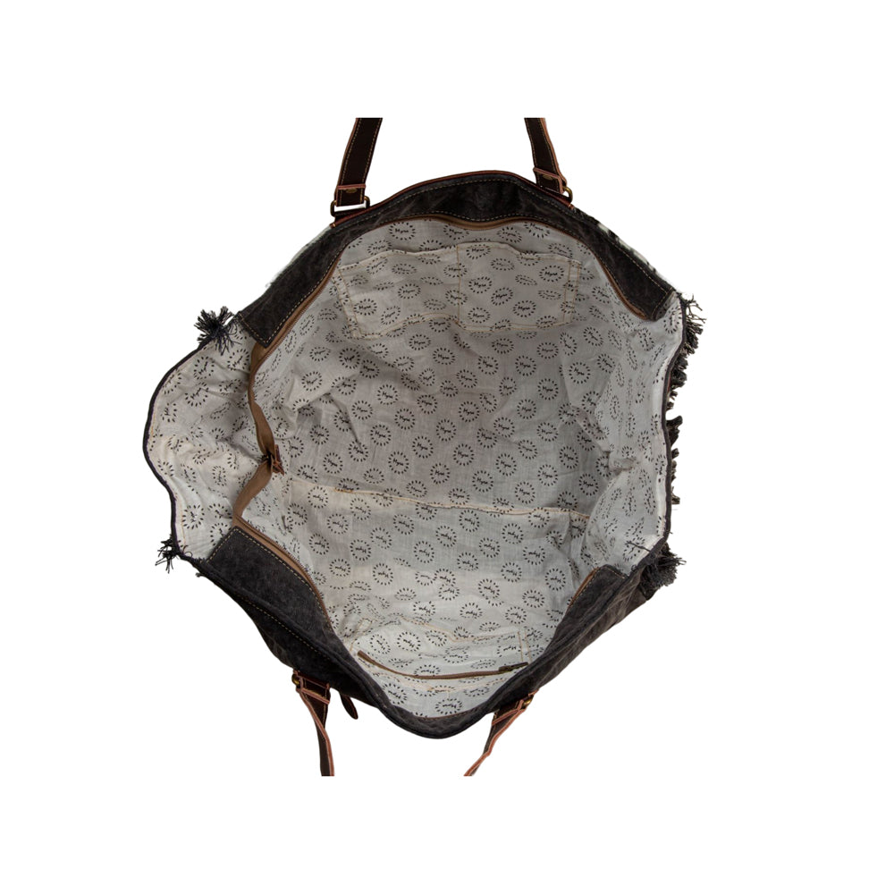 With its beautiful, balanced design, it’s no wonder this bag makes such a great presentation. The classic, beautiful hair-on hide and front panel of chocolate leather make an incredible combination. The hair-on hide continues on the sides, while smoky charcoal woven canvas completes the back with frayed-edge seams. Zipper-close top and durable matching leather carrying straps..